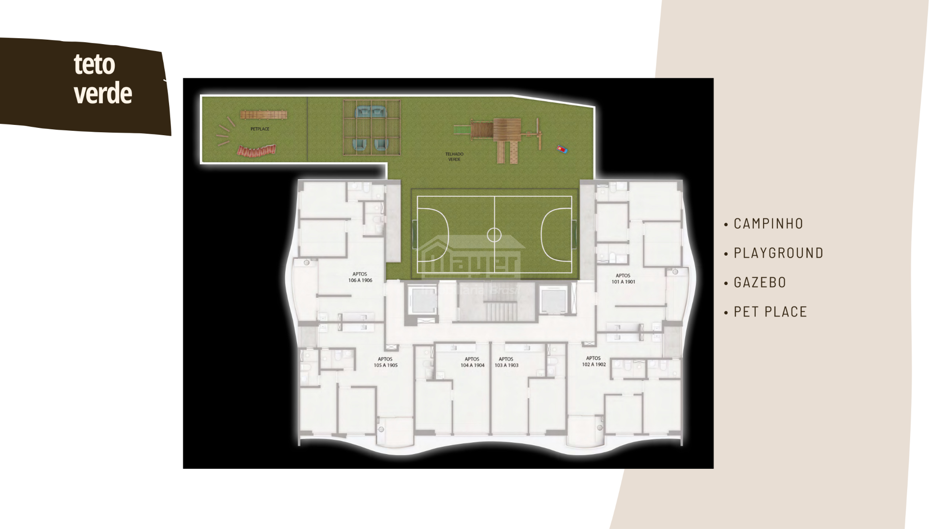 Piscina, salão de festas, espaço gourmet, coworking, academia, lavanderia, brinquedoteca, playground, campinho, pet place, mini market, box delivery e gazebo.