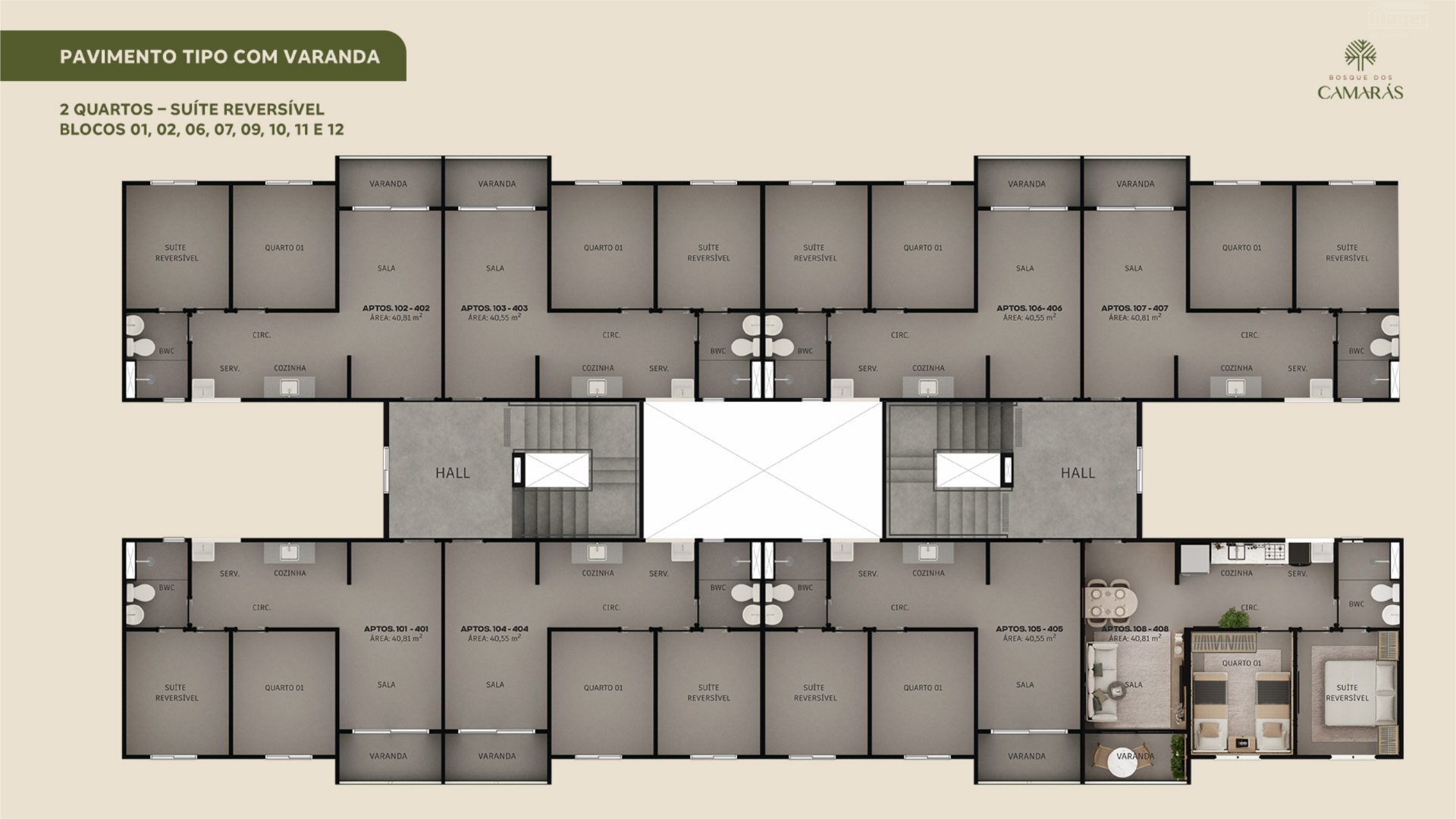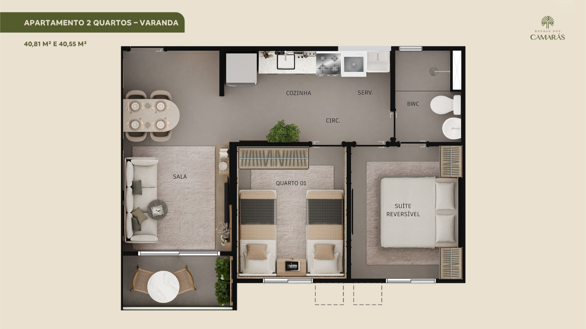 2 quartos com varanda – 41 m² - Térreo ou tipo a partir de R$ 202.000